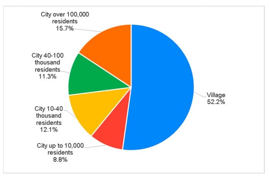 In the part of the survey addressed to adults, the age of the respondents ranged from 18 to 77 years. Geometric mean was SG = 25.96, median age (middle value) Me = 23 years, lower quartile being the limit of 25% of observations, Q1 = 21 years, and the upper quartile, indicating the limit of 75% of observations, Q3 = 30 years, modal, i.e., the most common value was 22 years. Most of the respondents were women, they constituted 57.5% of the respondents, and men accounted for 42.5%. The place of residence of the respondents is shown in Figure 5. In the group studied, 52% of the respondents lived in the countryside, and 15.7% lived in a city with more than 100,000 residents.