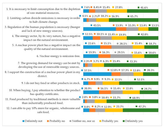 The literature emphasizes the relationship between the ecological attitude and the consumption of ecological products [72]. People with greater knowledge about the human–nature relationship, characterized by an ecological attitude, noticed the need to reduce consumption and emissions of pollutants. Therefore, shaping pro-ecological attitudes and the diffusion of knowledge about the real environmental effects of obtaining energy from various sources is crucial for reliable discourse and social participation in shaping the energy transformation [73].
