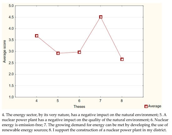 Figure 7 shows the average ratings of theses relating to the energy sector. These data show that among the respondents there was a belief that it was possible to meet the growing energy needs with energy from renewable sources. Respondents also showed moderate concern about the negative environmental impact of the energy sector. As far as nuclear energy is concerned, the average scores were approximately 3, which meant that there was no unambiguous opinion. On the other hand, the average assessment of the thesis supporting the construction of a nuclear power plant close to the respondents’ place of residence indicated moderate skepticism.