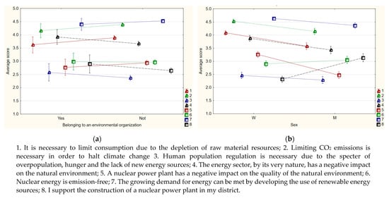 Figure 8 shows a comparison of the average ratings of theses in groups of people belonging to pro-ecological social organizations, and those not belonging to such organizations, and by gender. It should be noted that the differences in the perception of the impact of the energy sector on the environment were smaller depending on the fact of social activity of people in pro-ecological organizations than the differences between people of different sexes. It can be concluded that in the studied group, the social activity of the respondents was not related to the perception of the impact of the energy sector on the natural environment. At the same time, the lack of such a relationship may be the result of the fact that the majority of respondents are ecologically sensitive, which is confirmed by the results presented in Figure 6.