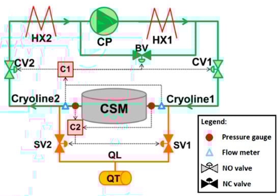 Supercritical Helium (SHe) is kept in motion in the SMCCC to cool down each CSM [68]. Figure 1 shows a simplified scheme of the SMCCC circuit with its main components. At nominal operational conditions, a nominal flow in the two cryolines and a downstream pressure [28,69] is ensured by a Centrifugal Pump (CP); the heat produced in the CP by the compression and in the CSM by AC losses due to pulsed operation is extracted from the SHe (in the heat exchangers HX1 and HX2, respectively) by Liquid Helium (LHe) at saturated conditions . In the SMCCC under analysis, several valves are present: the Control Valves (CV1 and CV2) are Normally Open (NO), whereas the two Safety Valves (SV1 and SV2) and the By-pass Valve (BV) are Normally Closed (NC); flow meters and pressure detectors send signals to controllers C1 and C2, respectively. Note that the SMCCC reported in Figure 1 is just a specific simplified configuration of the much more complex loops under construction in ITER, but it is relevant to develop and test the novel approach proposed here.