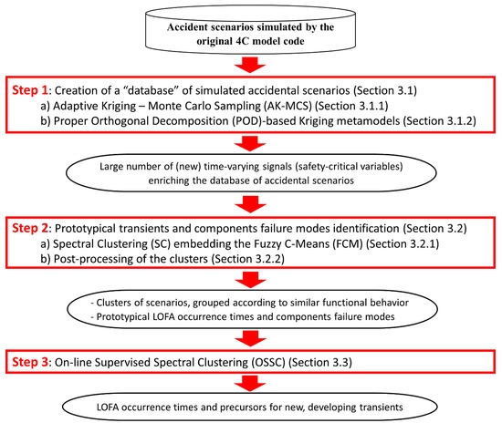 We propose a three-step method for the “online” characterization of newly developing scenarios relying on the analysis of the time-varying monitored signals [33,34]: (i) creation of a “database” of simulated accidental scenario (Section 3.1); (ii) clustering of the scenarios according to a measure of similarity, in order to characterize the “prototypical” evolutions of the system toward critical conditions (i.e., LOFA), together with the corresponding precursors (i.e., component failures) (Section 3.2); (iii) comparison of a new scenario with those belonging to the created database, in order to infer the possible component failures responsible for the signal evolution (i.e., of the system’s critical condition) (Section 3.3). The entire framework is summarized and sketched in Figure 2 for the sake of clarity.