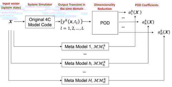 - Step (6): We provide a discretized approximation to the time-varying output for a new j-th scenario at the l-th time step as in Equation (9):where is the estimate of , resulting from the metamodel-based POD decomposition.