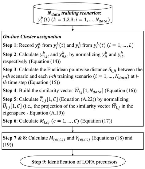 A novel Online Supervised Spectral Clustering (OSSC) method is trained with the available scenarios to timely identify LOFA precursors during the development of a new j-th accident scenario, different from the training ones. The j-th scenarios are characterized by the monitored critical variables and compared to those of the database () at each l-th time step. The algorithm proceeds each j-th scenario (the flowchart is sketched in Figure 5) as follows: