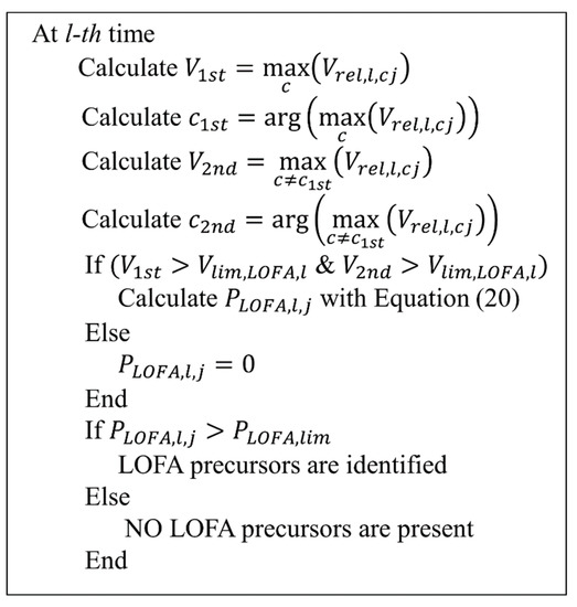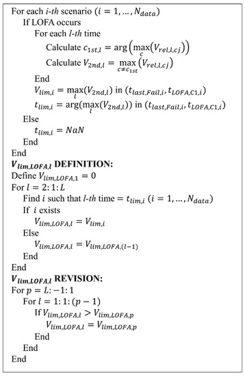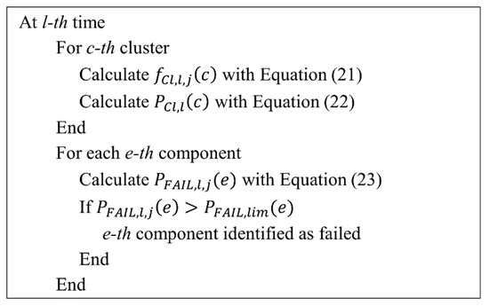 The scenarios belonging to the c-th cluster are post-processed to evaluate the following quantities: , which quantifies the probability that a LOFA has occurred at the l-th time step in a system state belonging to cluster c; and , which describes the probability that component e has failed at the l-th time step, given that a LOFA has occurred due to a system configuration of cluster c. The above-mentioned probabilities are quantified as in Equations (11) and (12), respectively: