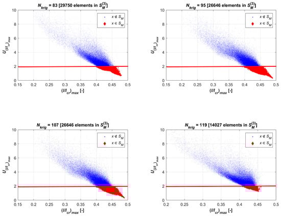 where is a properly selected “confidence” coefficient. Region includes those system configurations , for which the critical variable (estimated by ) is included between and (i.e., it lies “around” the failure threshold with a given confidence). In other words, the values represent lower and upper boundaries of the (failure) limit state surface including the prediction uncertainty of the Kriging metamodel. In this view, sets the confidence level: by way of example, for a two-sided α = 95% Confidence Interval (CI) (where is the inverse cumulative distribution function of the Normal distribution). By way of example, the lower boundary estimates the limit state surface under the assumption that the real value of every sample is instead of the mean value [38].