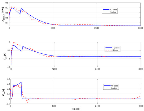 Once vector is sampled, it is sent an an input to the 4C code, which outputs the three critical variables and the mass flow rates, and , at the inlet and at the outlet of the CSM, respectively. When and for more than the validation time (), a LOFA takes place and is detected by controller C1 [31]; the LOFA detection time is indicated as .