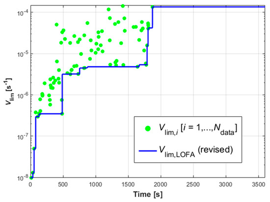 Here, is the o-th time interval, which the l-th time step belongs; and is the Heaviside function (Equation (13)) used to count the events of interest during that interval, i.e., the number of LOFA occurrences in Equation (11) and the e-th component failures () in Equation (12). Notice that the length of the o-th interval is here set to 300 s, as a satisfactory compromise between analysis resolution and computational tractability (the intervals should be large enough to count a statistically meaningful number of samples). Quantities (11) and (12) thus represent a discretization (with steps of 300 s) of the time-dependent probabilities described above.