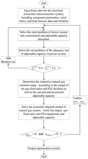 (5) By solving the natural gas system optimal dispatch model, the output of the gas-fired units and P2G facilities as well as the upward and downward adjustable capacity are verified. If both slack variables are zero, the solution is used as an effective solution to the optimization problem of the power system. Otherwise, the maximum output of the gas-fired units and P2G facilities is updated, and the upper power system dispatch model is resolved.