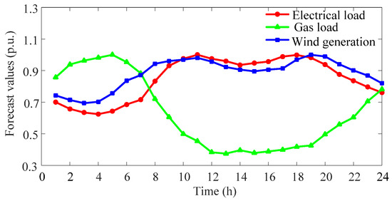 Forecast values of electrical load, gas load and wind generation.