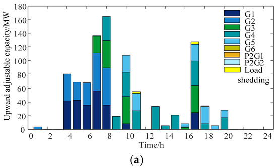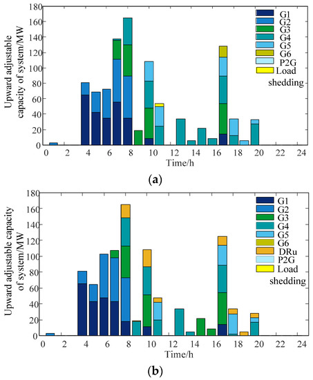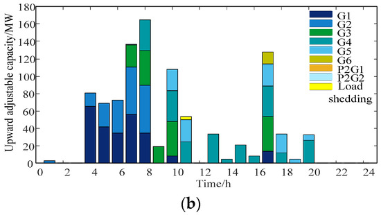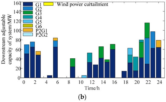 The scheduling results of the power system under the two cases are shown in Table 1, and the corresponding unit output curve is shown in Figure 4. And Figure 5 shows the downward adjustable capacity of the power system configuration under the two cases.