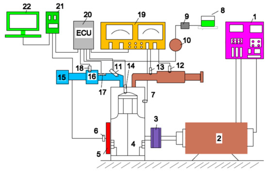 The engine experimental schematic and system are shown in Figure 1 and Figure 2, respectively. In the experimental setup a dynamo controller (1) was used to control the speed of the dynamo (MCA325MO2) (2); the coupling (3) was used to reduce sudden moments when starting the engine (4). The encoder (E40S8-1800-3-T-24) (6) and the thermal sensor (7) were used to measure engine speed and knock. The fuel supply system includes the fuel tank (8), filter (10), pump (9), and injectors (11). The air intake system includes the purifier box (15), throttle (16), heater (17), and temperature sensor (18). In the exhaust gas system housed the oxygen sensor (12) and temperature sensor (13). The cylinder pressure was determined based on sensor (14). The monitor (19), ECU (20), data acquisition (21), and computer (22) were used to analyze and observe output data.