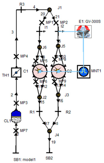 Figure 3 presents the engine simulation model. The element restrictions (R1, R2, and R3) displayed the pressure loss of the intake and exhaust tube (1, 2, 3…21). To collect or distribute the air flow through the pipe, the element junctions (J1, J2, J3, J5, and J6) were used. The measurements at the elements MP1 and MP2 were used to determine the flow characteristic (e.g., air-mass flow, air-flow velocity, air-flow temperature) in the intake and exhaust pipes. To supply fuel to cylinders C1 and C2, injectors I1 and I2 were used.
