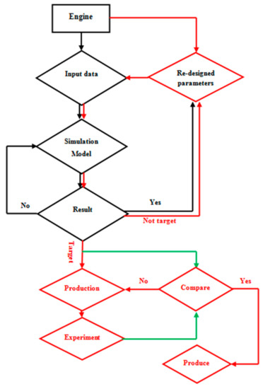 Figure 4 shows the steps taken to design the new valve mechanism using a simulation program and an experimental system. Two cycles were used. The first cycle (black cycle) was to develop the simulation model based on the original engine. The second cycle (red cycle) was the design and optimization process. The redesigned parameters were first estimated based on the simulation model. If the simulation results matched the target, then the new camshaft was manufactured; this new camshaft was estimated again via the experiments before being applied to the engine.