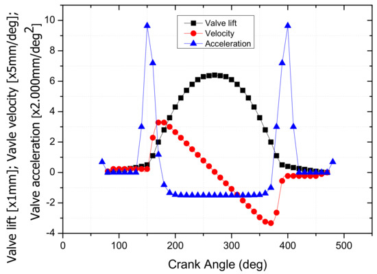 The basic circle diameter of the cam profile is 28 mm. The cam angle is 190 degrees, and the maximum valve lift is 6.5 mm for the intake valves and 6.4 mm for the exhaust valves. A successful design of valve mechanisms ensures smooth and effective cam profiles. C. Çınar et al. [11]. changed valve lifts using a 5th degree classical spline method. They were able to reduce the point contact of the cam profile. Design parameters for camshafts with new valve lifts have been calculated using the functions with finite differences in time [8,21,22,23]. In Figure 5, the black curve defines the valve lift (mm), as measured on the vertical axis. The red curve defines the cam velocity (mm/deg) at an engine speed of 5000 rpm, and is equal to five times the value on the vertical axis. The blue curve defines the cam acceleration (mm/deg2), which is equal to two thousand times the value on the vertical axis. Using the first-order derivative of the movement with respect to the cam angle, the new cam velocity curve was defined with a maximum value of 6.4 mm/deg. Using the second-order derivative of the movement with respect to the cam angle, the profile of acceleration was defined with a maximum value of 0.0485 mm/deg2.