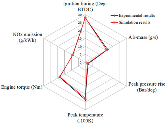 Figure 6 represents the validation of ignition timing in both cases at an engine speed of 5000 rpm. Regarding ignition timing, the values of the experiment and simulation model were equal because the ignition timing and combustion duration were provided manually in the simulation model. Regarding air mass flow, a comparison between the results of the experiment and the simulation model is depicted. The maximum difference was 1.42%. This maximum difference is acceptable because the value of air mass flow was an average value during the experiment. The experimental and simulation results of the brake torque of the two cases were similar. The maximum difference was 0.9%. The results of the comparison of the two cases support the simulation model; the simulation model had good accuracy in terms of predicting ERG and ERE in further studies.