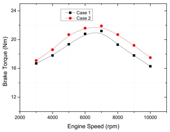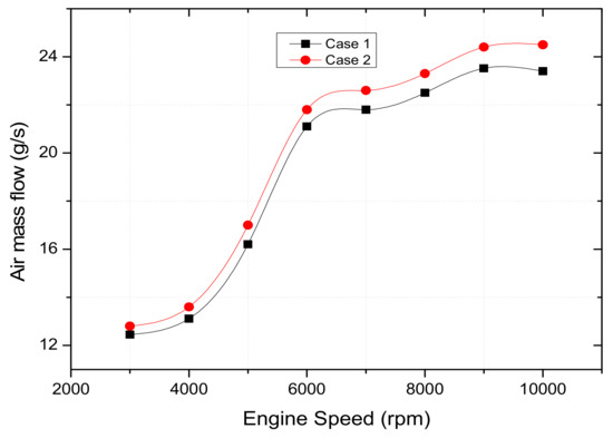 The higher engine speed leads to an increase in the air mass flow, as shown in Figure 8. The values for air mass flow in case 2 (with the new valve mechanism) were higher than in case 1 at each engine speed. The difference was less within the engine speed range from 3000 to 6000 rpm. This indicates that, at low and medium engine speeds, the effects of the new valve mechanism on air mass flow are small. However, when the engine speed was between 7000 and 10,000 rpm, the difference in air mass flow increased. This may be explained because the effects of the new valve mechanisms on air mass flow are larger than those at low speeds. In turn, this is because, at high speeds, the vacuum pressure in the intake cylinder was greater than that at low and medium speeds.