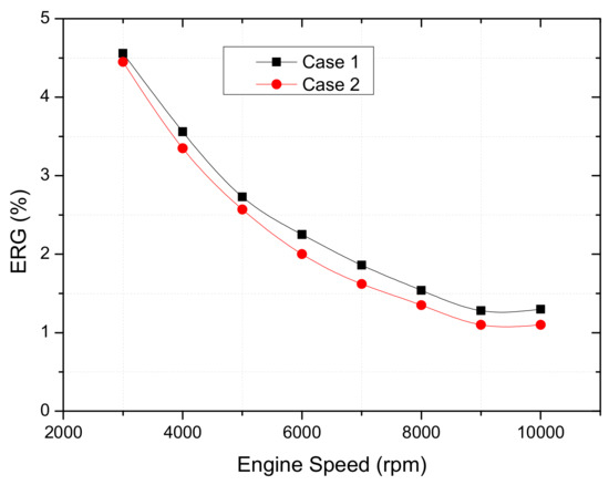 In the intake stroke, the increase in intake air mass flow into the combustion chamber helps to sweep burned gas outside, resulting in the decrease in ERG, as observed in Figure 9. The internal exhaust residual gas is trapped in the combustion chamber because the reverse burned gas flows back to the combustion chamber through the intake or exhaust ports. This ERG premix with the fresh air–fuel mixture and affect combustion stability, charge mass, flame speed, and emission of toxic products in the next combustion stroke. The ERG flow can be controlled by changing intake valve timing, exhaust valve timing, and valve overlap (the valve timings were controlled by valve mechanisms). The ERG has a significant effect on the engine performance and emission characteristics [17], and a suitable amount of high temperature ERG helps to improve the homogeneity of the air–fuel mixture, thereby improving the combustion. By comparison, the increase on ERG leads to an increase in the dilution of the air–fuel mixture, resulting in a reduction in the burning temperature. The decrease in the burning temperature helps to improve NOx emissions. Thus, it is necessary to investigate the effect of the valve mechanisms on the exhaust residual gas.