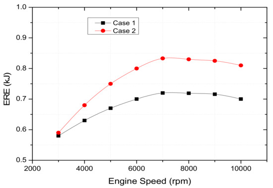 In the internal combustion engine, the effective release energy is determined based on the remaining energy after losing heat energy due to transfer and pumping loss. To improve the heat energy, the combustion duration should be reduced and a faster release het energy is required to reduce heat transfer loss. As discussed previously, a suitable ERG helps to improve the homogeneity of the air–fuel mixture, thus reducing the combustion duration and reducing the heat transfer loss. Hence, the effective release energy increases until reaching the maximum value at 7000 rpm, before subsequently decreasing. Figure 10 presents the effect of the new cam design on the ERE at each engine speed. With the new valve mechanics, the engine presents a higher ERE value. The maximum ERE was 0.835 kJ at 7000 rpm, representing an improvement of 15%. This improvement in ERE can be explained because the decrease in ERG helps to decrease the dilution and increase the homogeneity of the air–fuel mixture, thus helping to reduce the time required to release the chemical energy into thermal energy, and the time for the heat loss transfer within the cylinder and piston surfaces. When the engine speed was higher than 7000 rpm, the effect of the ERG on improving the homogeneity of the air–fuel mixture was smaller. In addition, the increase in the combustion duration led to an increase in the heat loss, resulting in a downward trend in the effective release energy.