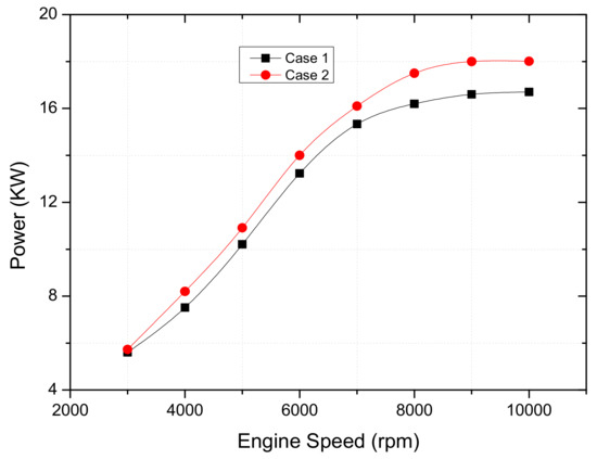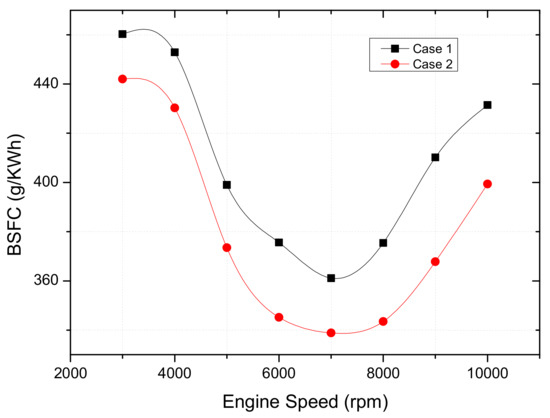 The engine brake power is strongly dependent on the engine brake torque and engine speed. The uptrend of engine power following the increase in engine speed is presented in Figure 12. Due to the improvement in engine brake torque, a higher engine brake power with the new cam design is presented compared to that of the original cam. The maximum power was 18.01 KW at 9000 rpm, an increase of 7.84%. The trends of the BSFC in the two cases were similar, but the BSFC value in case 2 was smaller than that in case 1 (Figure 13) due to the higher engine power of case 1. The minimum BSFC of both cases occurred at 7000 rpm. With the new cam design, the minimum BSFC was 338.86 g/KWh, a decrease of 6.15% compared to that of the original cam profile.