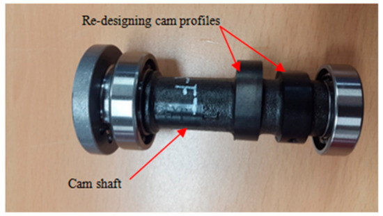 A new cam was constructed based on the classical spline method, with a basic circle having a diameter of 28 diameter, a cam angle of 190 degrees, a maximum intake valve lift of 6.5 mm, and an exhaust valve lift of 6.4 mm. As discussed in Section 3.2, a simulation model was used to estimate the effects of the new cam shaft on the engine performance. Data from the new cam design were used for computer-aided design, and cams were manufactured from AISI-SAE 4140 steel by Computer Numerical Control wire erosion machining. The new camshaft is shown in Figure 14.