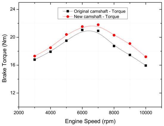 The ERE had a significant effect on engine torque; similar trends for ERE and engine torque can be observed in Figure 10 and Figure 11. The engine torque increased until achieving a maximum value at 7000 rpm, after which it declined. Figure 11 shows the effects of the cam profile on engine torque. With the new cam design, engine torque was improved at every engine speed due to the increase in ERE and the reduction in heat loss. The engine was able to achieve a maximum torque of 21.9 Nm at 7000 rpm, representing an increase of 3.3%.