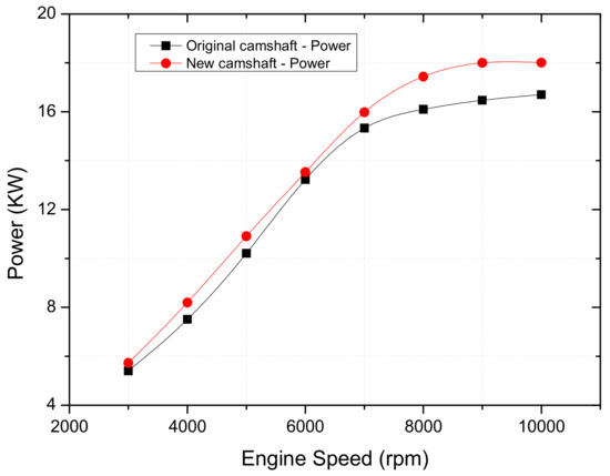 An improvement in engine torque with the new camshaft can be observed in Figure 15. The maximum engine torque was 21.53 Nm at 7000 rpm, an increase of 3.2%. The maximum engine power was 18.1 KW at 9000 rpm, an increase of 7.2%, as shown in Figure 16.