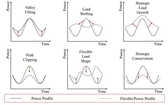 Demand-side management (DSM) programs can be considered as control strategies for the loads. Figure 2 shows different DSM programs for smart grid systems allowing the control of the load efficiently and flexibly. DSM programs, such as peak clipping, load shifting, and flexible load shapes are supporting new flexibility options (i.e., through ESSs) to meet the requirements for future markets [32,33]. Besides these, valley filling is suitable for processes operated in the evening and night hours. In manufacturing processes, strategic load growth and strategic conservation are highly depending on the capacity of material storages and buffers.