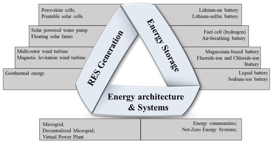 Related to the increase in the energy efficiency and; therefore, to the ecological aspects, the planning of NZESs has to focus on new technologies requiring less primary energy (fuel, sun radiation, geothermal heat) to produce the same amount of energy output (electricity, mechanical, heat or cold). Even if there is no clear definition, a short-term planning horizon is generally understood as a planning action, which will be put in place within one or two years. A long-term planning horizon generally considers the possibility of upgrading a system in a time horizon ranging between eight and ten years. In this context, it is important to choose technologies with a technology readiness level (TRL) at least equal to 8 for short-term planning actions. Table 1 explains the state of technology development for different readiness levels. It is important for long-term planning, to consider the prospective industrial maturity of prototypical technologies and; therefore, also emerging technologies which might affect the whole energy efficiency of the NZES. Figure 3 points out some of the most promising disruptive technologies for energy generation, storage, architectures and systems. According to [35,36,37,38,39,40], the Perovskite-based solar cells, multi-rotor wind turbines, and geothermal-based technologies have the highest disruptive effect among the RES technologies. New lithium-based batteries, as well as hydrogen and liquid batteries, might dominate the market solutions for energy storage applications. Microgrids, virtual power plants, and net-zero energy systems can be chosen as architecture to plan the industrial and tertiary sites. It is a good practice to choose technologies, which have already been tested in pilot projects. In addition, another important factor to think about when selecting the technologies necessary is their “ready-to-use” parameters. The latter indicates the time horizon during which the technology chosen will affect the system.