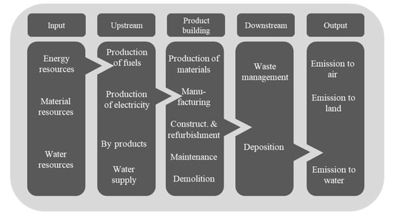 Another important aspect to be considered when selecting the technologies is their “cradle-to-grave” parameter, which analyses the life cycle of a construction product using ecological key indicators, such as the resources used, the upstream and downstream products, and the emissions to air, land, and water (see Figure 4).
