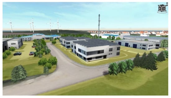 The space development analysis assesses the visual and spatial planning effects parallel in one planning model. This approach uses photorealistic three-dimensional models and tools based on virtual reality aiming to improve interdisciplinary project communication, strengthen the acceptance of development projects in the population and reduce the risk of unintended effects. Figure 6 shows a virtual reality-based representation of the data center analyzed and the visual impact that photovoltaic panels and a wind farm might have on the tertiary site. Such analysis allows for accelerating the process of social acceptance of the residential users living near the considered site (see houses located on the center-right part of the picture).