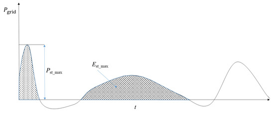 The necessary flexibility options to compensate for the volatility generation of RESs focused on ESSs (electric and thermal) allow for the development of DSM controlling strategies. The identification and planning of the required flexibility options depict the third layer of the suggested methodology. The sizing and control of such flexibility options affect the maximal integration of RESs positively. However, their use also has a negative impact since it increases energy losses. The integration of RESs into the NZES requires that the flexibility options are properly sized. Since the NZES concept targets considered minimizing the power to be fed into the grid, Equation (1) can be considered as a starting point for sizing the ESS. The sizing has to consider both the power and the energy capacity of the ESS. By considering a long-term horizon, the power capacity is evaluated by finding the maximal value of Pgrid(t), while the energy capacity might be estimated by considering the highest area tracked above the positive y-axis, indicated by Est_max (see Figure 7). It is important to note that this approach does not guarantee that the sizes found are optimal, but it gives an indication of the sizes expected.