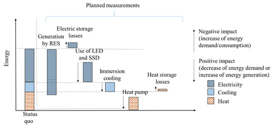 Figure 8 shows, from a qualitative point of view, the effect of the planned measurement on the operation of the system as net-zero energy. The status quo depicts the amount of energy consumed by the data center. It is divided into three energy forms: electricity, cooling, and heat. The on-site generation of electric power by RES might contribute to cover more than half of the total energy demand. On the energy efficiency layer, LED and SSDs as well as immersion cooling systems and more efficient heat pumps offer a relevant contribution to decrease the demanded energy. However, the needed flexibility to integrate the volatile RES negatively affect on the energy balance of the data center. Indeed, the use of energy storage systems (electric and thermal) increases the losses and; therefore, contribute to an increase of the energy demand.