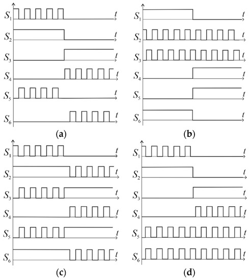Different modulation strategies for the ANPC converters (a) PWM 1, (b) PWM 2, (c) PWM 3, (d) PWM 4.