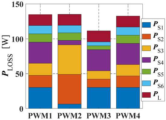 The simulation tests were performed at near-nominal parameters (see Table 2) for all five PWM methods described in Section 2. The impact of the different modulation techniques on the total power loss and its distribution among the converter components based on the simulation study can be observed in Figure 5. In general, for the system parameters, PWM4 is the optimal technique for maximizing efficiency, as the total power loss reached just 114 W, while other PWM methods (PWM1, PWM2, and PWM4) settled close to each other at roughly 137 W.