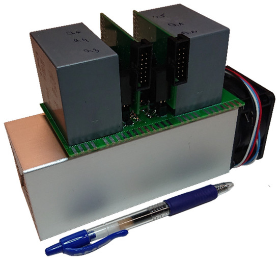 In order to validate the system experimentally, the next step was to design and construct the ANPC leg prototype. Since the system was to operate with a ±750 V DC bus, at least 1200 V rated transistors were needed in the multilevel structure. Based on preliminary calculations from the simulation study and analytical calculations, NTH4L040N120SC1 SiC MOSFETs were chosen from a group of on the shelf, state-of-the-art power devices as all of the switches, since these are characterized by satisfactory on-state resistance of 40 mΩ and external Kelvin source connection. Therefore, they lead to minimized conduction and switching losses and provide the possibility to switch the transistor in a fast and a robust manner. Furthermore, as mentioned before, it was crucial to minimize the conduction loop lengths in order to lower the effect of parasitic inductances that could lead to excessive ringing, and cause overvoltages and increased power loss, which could result in working outside the safe operating area of the power device and potentially even breakage. This was achieved through the employment of a 4-layer power board structure along with a highly compacted layout of the SiC MOSFETs, as well as additional 82 nF fast bypass capacitors, put between +/0 and 0/− potentials as close to the power devices as possible. Since the plan was to test several PWM methods, none of the conduction paths were favored, and all were of similar length. However, such placement of the transistors leads to a situation where the whole semiconductor power loss has to be dissipated in the near vicinity of the center of the heatsink, thus leading to a less balanced heat distribution; in summary, more capable power loss dissipation measures had to be used. Therefore, as the submodule was to operate with a power of near 6.7 kW in a low-volume system, heatsink Fischer LAM 6 with a highly efficient 48 V fan was employed in the prototype shown in Figure 6.