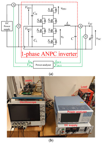 Experimental setup for the ANPC single-phase inverter system with a resistive load—(a) scheme, (b) photo.