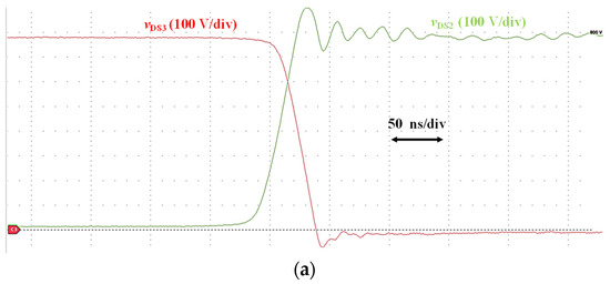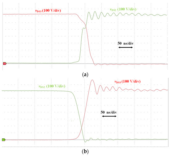 Exemplary experimental waveforms showcasing drain–source transistors for positive load current (iAC > 0) for the modulation technique with highest overvoltages (PWM2)—(a) turn-on, (b) turn-off.