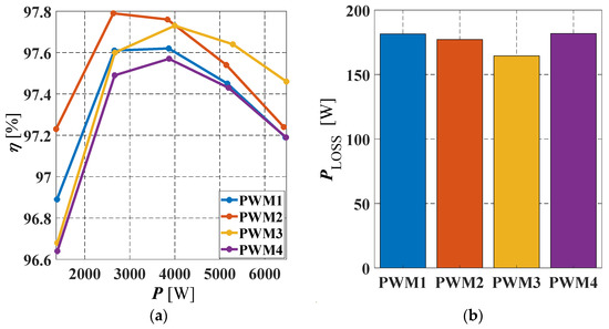 Furthermore, to exhibit the difference in actual loss values rather than efficiency, Figure 11b focuses on the power loss difference for different modulation techniques at the nominal operating point with the full power of 6.5 kW. When we compare the results from the experimental tests with the simulation study (see Table 4) we can observe that the presumptions noted in Section 3 are confirmed via the experiments on the prototype as well, with lowest power losses for PWM3 with 165 W. In contrast, techniques PWM1, PWM2, and PWM4 settled close to each other at 182, 177, and 182 W respectively.