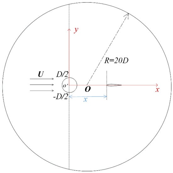 This paper studied the two-dimensional cylinder–airfoil tandem configuration, and the computational domain is shown in Figure 2. Specifically, the cylinder diameter D is 100mm, and the airfoil chord length is equal to the cylinder diameter (l/D = 1.0). Besides, NACA0012 airfoil chord along the x-axis and the distance between airfoil leading edge and cylinder center (x/D) can be adjusted. Furthermore, the radius of the computational domain is set as 20D, so as to remove the influence of boundary conditions of subsonic velocity. The NACA0012 airfoil located downstream oscillates along the 1/4 chord point in pitch, and its attack angle is changed as in Equation (2):