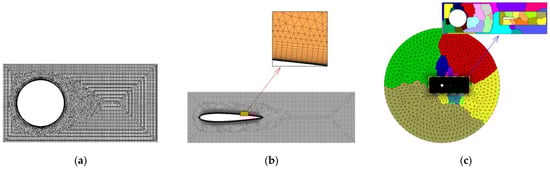 The grids are composed of a cylinder mesh, a mesh near the airfoil, and a background mesh. Among them, the background mesh covers the whole computational domain. Furthermore, the mesh can be divided into structured and unstructured hybrid meshes in accordance with Figure 4a,b. Specifically, quadrilateral mesh and triangular mesh are adopted for the body-fitted mesh near the cylinder as well as airfoil walls, respectively. To seize the viscous boundary layer more accurately, the body-fitted quadrilateral mesh is equipped with more than 20 layers. Moreover, the mesh near the object is properly encrypted in the background mesh, so that the flow field around the object can be displayed more subtly. Besides, the mesh is processed into blocks before computation for conducting parallel calculation and improving the computational efficiency. More precisely speaking, cylinder, airfoil, and background meshes are partitioned into 16 blocks, respectively, as shown in Figure 4c.