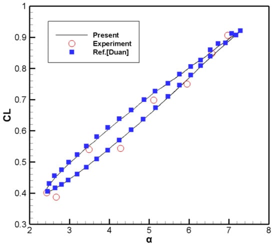Firstly, the steady flow field at the average attack angle is calculated for the initial field of unsteady simulation. The lift coefficient varying with the attack angle is shown in Figure 5, incorporating the experimental results of Landon [40] and numerical results of other researchers [41]. The computational result of this paper agrees well with the numerical simulation results in the literature, and is basically identical with the distribution of the experimental results. This proves that the numerical method used in this paper can accurately simulate the pitching oscillation of the NACA0012 airfoil at a small attack angle.
