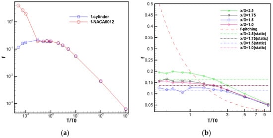 The coupling frequency of lift coefficient varying with various airfoils and x/D is shown in Figure 6b, comparing with the variation frequency of the static cylinder lift coefficient. As T/T0 increases, the coupling frequency will decrease. The coupling frequency and static results have little difference under high-frequency oscillation of the airfoil, whereas the former approaches the airfoil oscillation frequency at low-frequency oscillation. It is evident that spectral characteristics in the wake of a cylinder have a greater influence on the airfoil low-frequency oscillation.