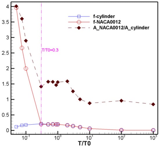 Aerodynamic characteristics of the airfoil and cylinder are changed periodically under the combined effect of the airfoil oscillation and the cylindrical wake. Concretely, the aerodynamic coefficients’ frequencies of the cylinder and airfoil vary with the increase of T/T0, as shown in Figure 6a. When T/T0 is less than roughly 0.2, the frequency oscillation modes of cylinder and airfoil also change, and the smaller the T/T0, the greater the difference. Besides, when T/T0 is greater than the critical value, the frequencies of both are coupled, which is called “aerodynamic coupling” in this paper.
