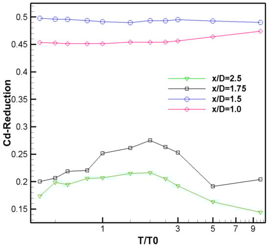 Figure 8 indicates that the relationship between the drag reduction rate of tandem configuration and T/T0 is related to x/D (the distance between the airfoil leading edge and the cylinder center). Moreover, two completely different tendencies before x/D = 1.5 and after x/D = 1.75 are presented in the curve of drag reduction. To be specific, when x/D ≤ 1.5, the drag reduction rate varies slightly, which can reach above 45% within the studied range. When x/D ≥ 1.75, the drag reduction rate is relatively small, reaching 30% at most. As T/T0 increases, the drag reduction rate increases at first, and then decreases with the maximum value taken around T/T0 = 2. The reasons are shown in Section 3.2.