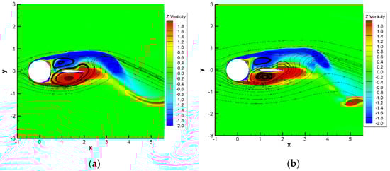Vorticity contour at the moment of drag coefficient amplitude (x/D = 1.0): (a) T/T0 = 2.0; (b) T/T0 = 5.0.