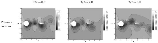 Pressure contour and pressure coefficient of the cylinder wall at x/D = 2.5 are displayed in Figure 10 (φ = 0 represents the cylindrical wall when x = −0.5, and φ increases clockwise). A low-pressure area can be observed at the trailing edge of the cylinder (partially y < 0). When T/T0 ≤ 2.0, the increase in the oscillation period will suppress the development of the low-pressure area. The pressure difference between the first half (φ ∈ [0°, 90°]∪[270°, 360°]) and second half of the cylinder (φ ∈ [90°, 270°]) gets lowered gradually. On the contrary, when T/T0 ≥ 2.0, the increase in the oscillation period will promote the development of the low-pressure area. In addition, together with the rising pressure difference between the front and back surfaces of the cylinder, the drag reduction rate will decline.