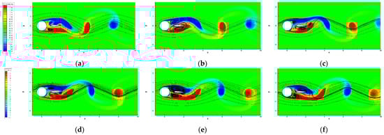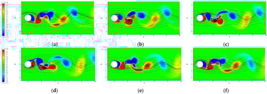 The wake vortex of the cylinder in the flow field can be called the “primary vortex” for its dominating effect. Taking the local flow field of y < 0 as an example, when the primary vortex meets the NACA0012 airfoil, since the vortex length is far greater than the airfoil chord length, the latter is wrapped by the primary vortex, as shown in Figure 11b. When the primary vortex marches to the middle of the airfoil, a low-pressure area will form, causing the induced vortices generated in the trailing and leading edges of the airfoil successively, as shown in Figure 11c. In the meantime, the airfoil, like a vortex separator, can divide the primary vortex into two parts. As can be observed from Figure 11d, a part of vortex is fused with the induced vortex generated by the upper airfoil in the trailing edge, while the other part is fused with the induced vortex developed at the lower airfoil in the leading edge. After that, the new primary vortex flows past the upper airfoil, as shown in Figure 11e. The direction of the primary vortex at the upper airfoil is opposite to the residual vortex at the lower airfoil, and the primary vortex at the upper airfoil expands and pushes the vortex at the lower airfoil to move along the opposite direction of inflow and collide with the cylinder surface, as shown in Figure 11f. Next, the flow separation at the y < 0 section is aggravated. Hence, the vortex that is pushed to the surrounding wall is accumulated, forming a new primary vortex to repeat the above process.