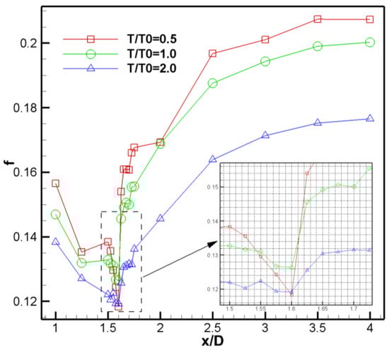 Since the airfoil oscillation upon aerodynamic coupling has a greater influence on the wake of the cylinder, three groups of varied T/T0 values after the critical period are selected for the study in this section, that is, T/T0 = 0.5, 1.0, 2.0. The variation of the coupling frequency with x/D is shown in Figure 13. It can be seen that the three groups of varied T/T0 present the same variation trend. When x/D ≤ 1.6, the coupling frequency will gradually decrease as x/D increases, with the minimum coupling frequency at roughly x/D = 1.6. Besides, when x/D ≥ 1.625, the coupling frequency will be on the rise, and when x/D > 3.5, the coupling frequency will become stabilized.
