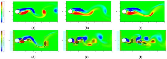 When x/D ≤ 1.6, the wake vortex of the cylinder is fully developed with the rising x/D. In this case, longer time for the vortex interaction with the airfoil is required as the length of vortex increases, so as to form a relatively stable vortex to shed from the airfoil trailing edge, as shown in Figure 14a–c. Consequently, the distance between the initial shedding position of the vortex and the airfoil trailing edge increases gradually, together with the decline in coupling frequency. When x/D ≥ 1.625, a stable Karman vortex street forms between the cylinder and the airfoil. Moreover, as x/D increases, the vortex street is dissipated before flowing past the airfoil, leading to a decrease in the strength of the vortex street, along with shorter interaction time with the airfoil. As depicted in Figure 14d–f, the distance between adjacent vortices in the airfoil wake reduces with the growth of coupling frequency.